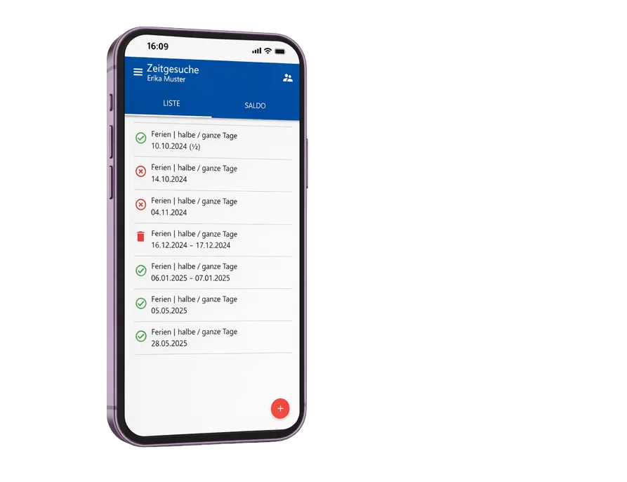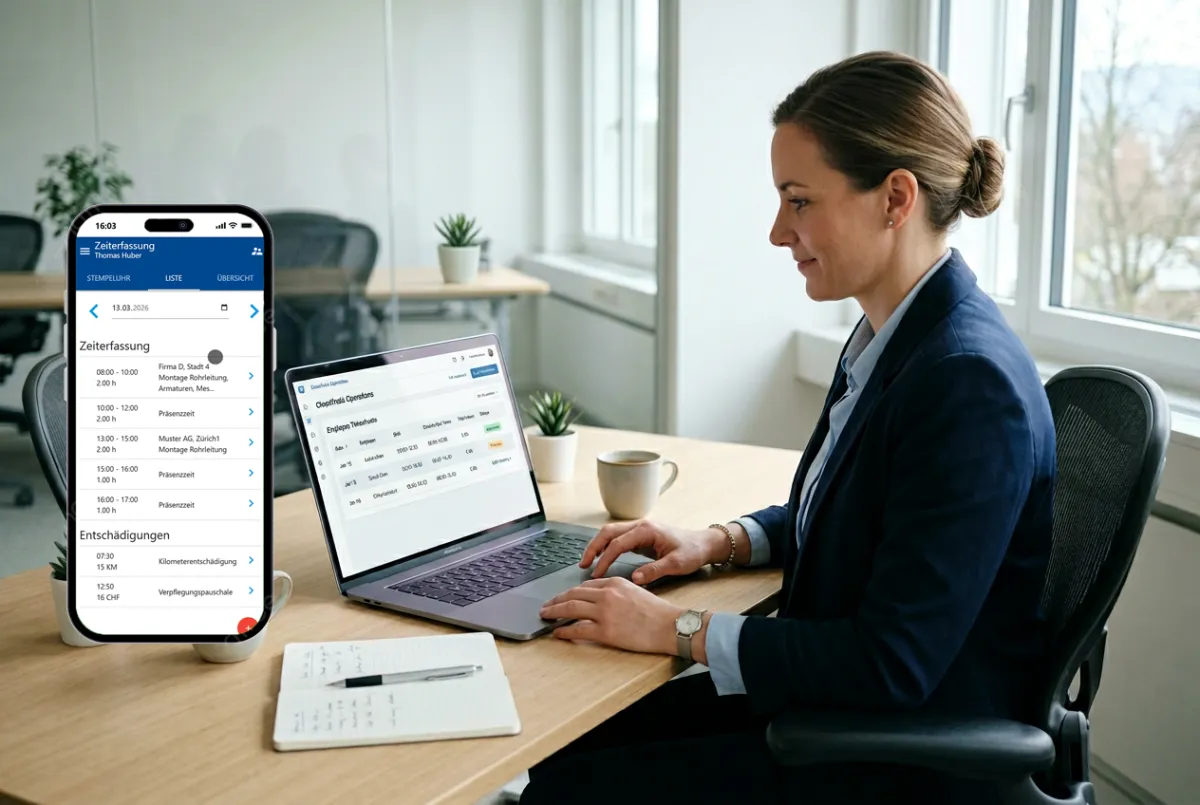 Mit der mobilen Lösung erfassen Mitarbeitende ihre Zeiten und Spesen bequem über die App - auf dem Smartphone, Tablet oder PC. Auch Feriengesuche können jederzeit und von überall mit Internetzugang eingereicht werden.