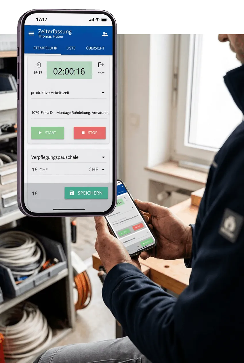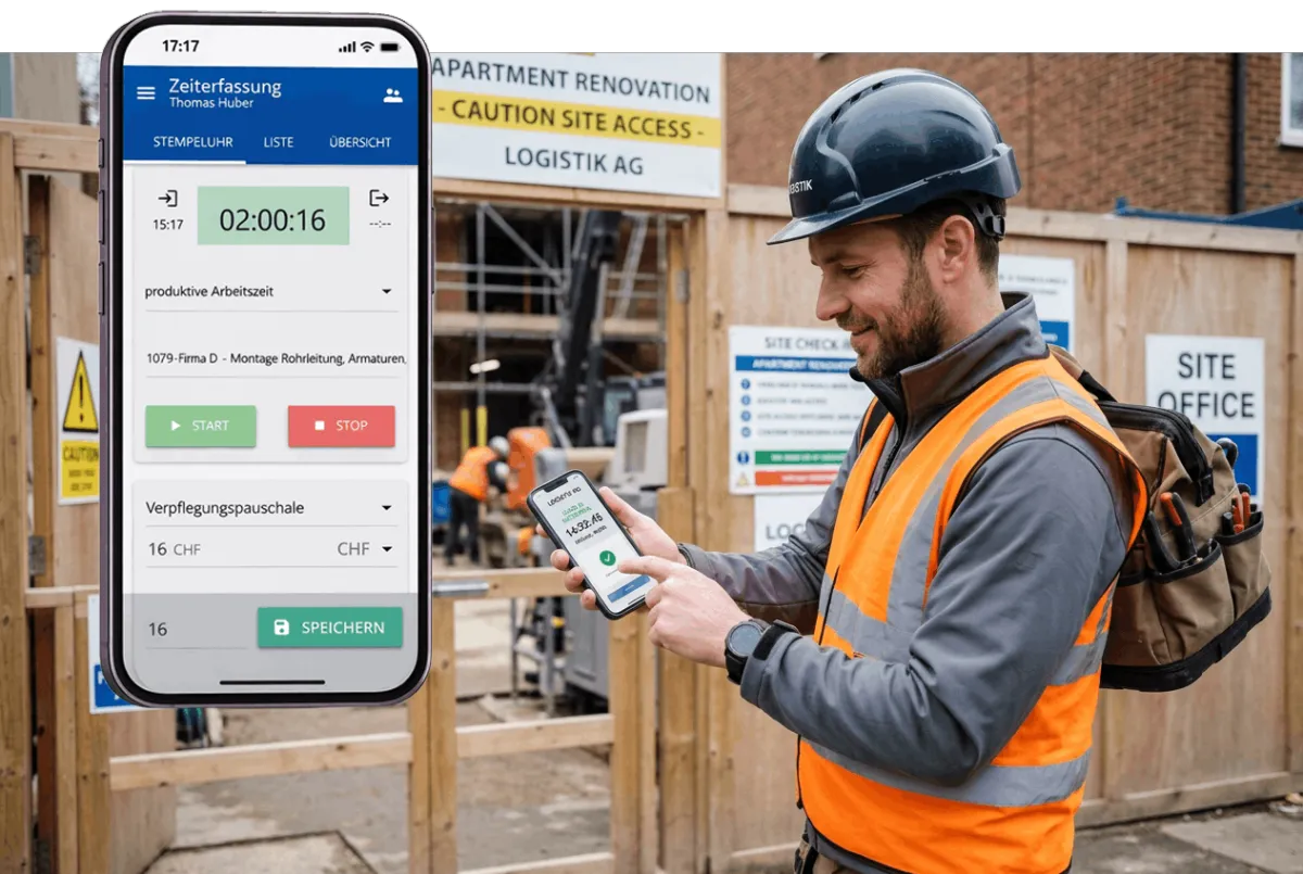 Mitarbeitende können ihre Zeiten direkt vor Ort über das Smartphone erfassen. Optional kann der Einsatzort über NFC-Tags oder QR-Codes bestätigt werden.